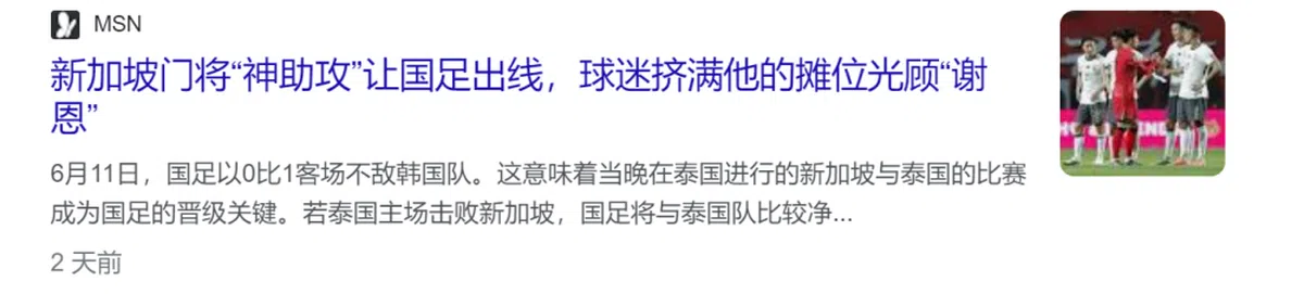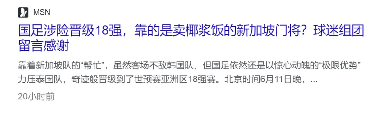 但是中国球迷疯狂感谢的,却是与中国足球毫无关系的新加坡门将,嚷嚷得全世界都知道中国球队的恩人是新加坡的门将,也因此注意到中国的晋级有多么尴尬。