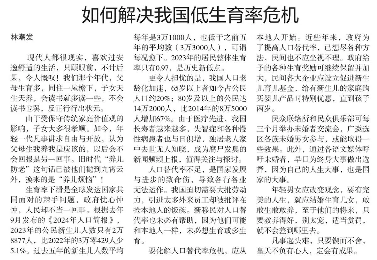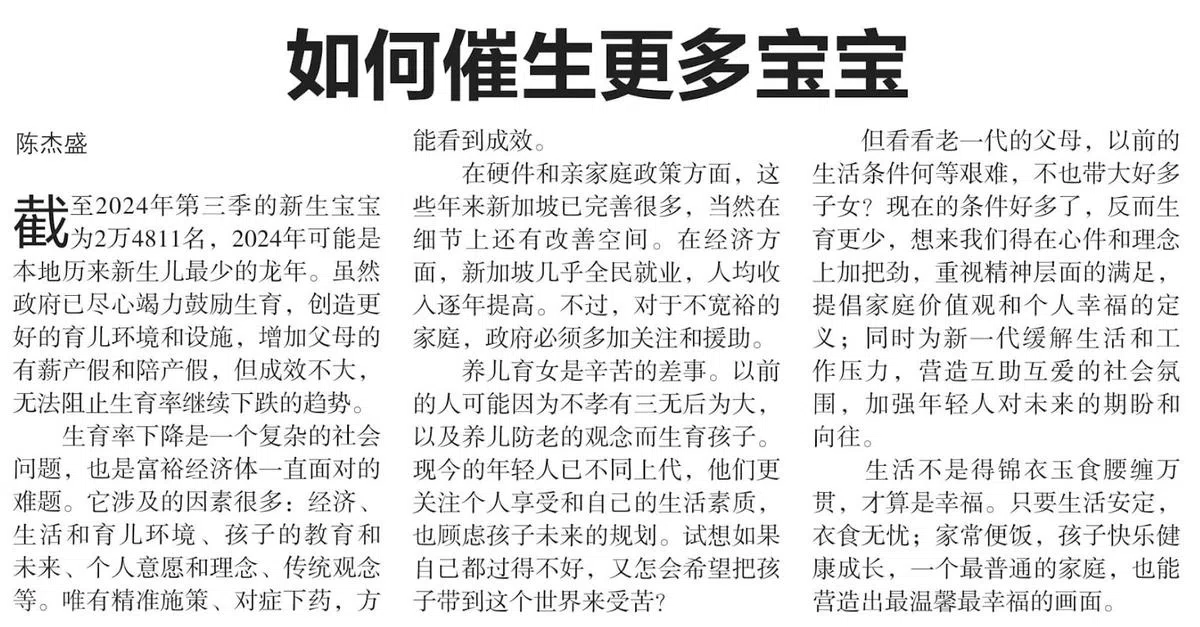 人们没有忽略这个现象,《联合早报·交流站》1月13日一口气刊登了三封读者来函,都在为新加坡的低生育率表示担忧,并提出一些建议。