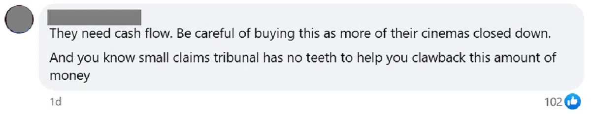 “他们需要现金流。购买(套票)时务必当心,因为他们很多戏院已经关门了。而且你知道,对于这类小额索赔,法庭并没有足够的执行力来帮你追回这么一笔钱的。”
