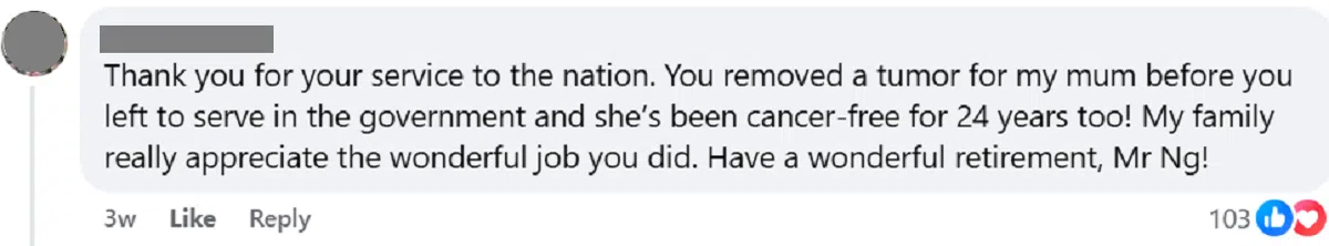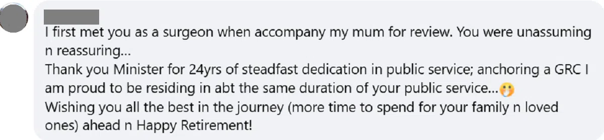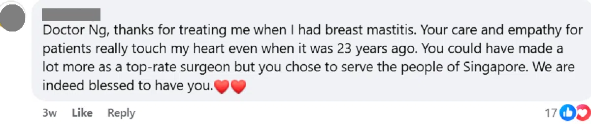 “黄医生,谢谢你帮我治疗乳腺炎。23年前,你对病人的关怀与共情深深触动我。你原本可以成为一流外科医生赚更多钱,但你却选择服务新加坡人民。我们能拥有你是一种福气。”
