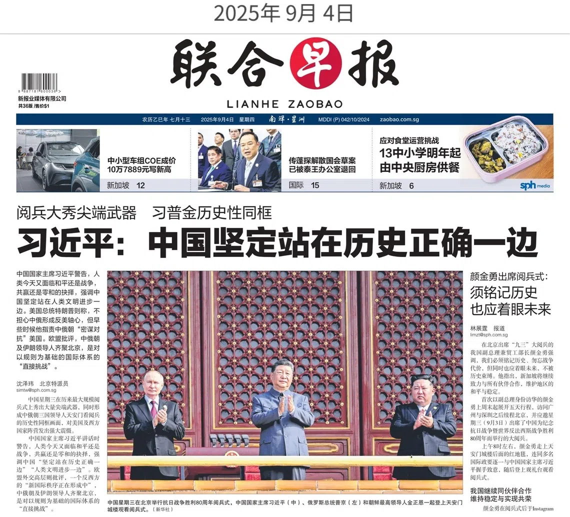 《联合早报》隔日封面大照片上只见天安门城楼上,中国国家主席习近平右侧是俄罗斯总统普京,左侧是朝鲜最高领导人金正恩,这张“普希金”照片把一个富历史意义的场面定格在一个国际竞争激烈的时间节点上。