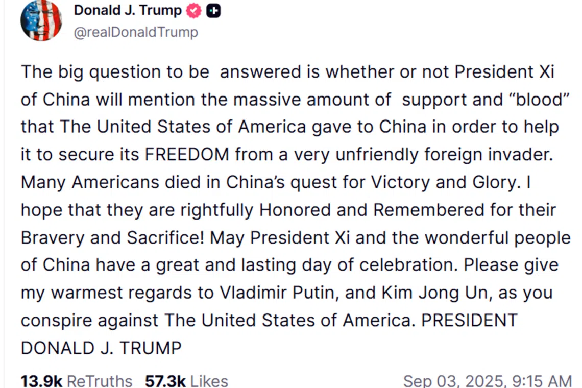 守在白宫(正值美国晚上时间)看直播的美国总统特朗普一方面恭贺中国办了一次“令人印象深刻”的阅兵式,另一方面酸溜溜地影射中俄朝三国密谋对付美国。